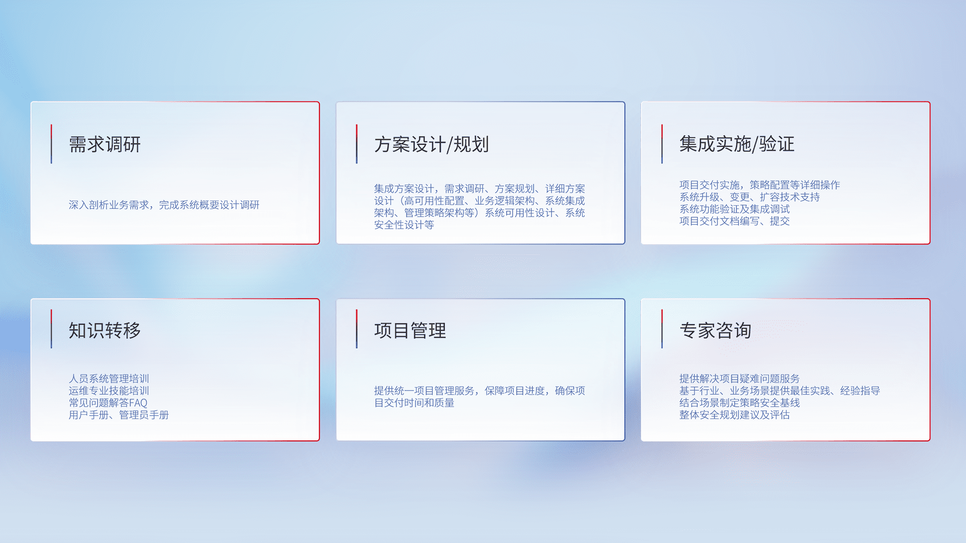 针对客户行业特性,,,将宏观的安全战略和需求,,通过专业的交付服务,,实现项目落地,,为客户提供标准规范的集成交付服务。。。